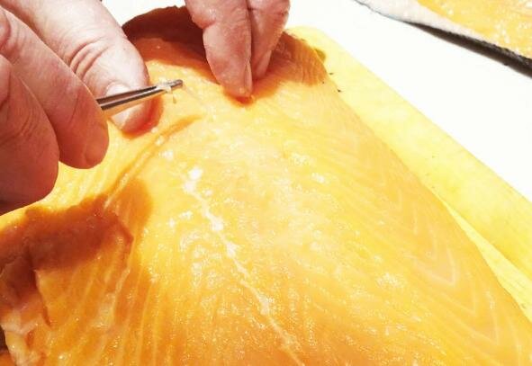 Małe ości z fileta wyjmuje się pęsetą. W ten sposób mięso zachowuje swoją strukturę i wygląd. Ale nie musisz usuwać skóry przed soleniem. Dzięki niej ryba zachowa swój naturalny bogaty smak.