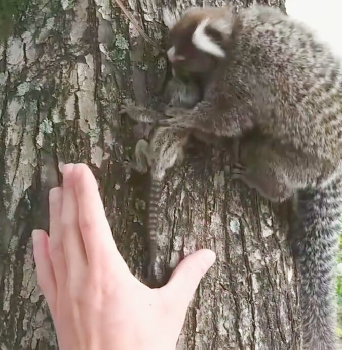Gdyby w tej chwili pojawił się przypadkowy samochód, drapieżny ptak lub zwykły kot, małpka maiłaby poważne problemy. Więc mężczyzna wziął maluch i zaniósł go jego matki.