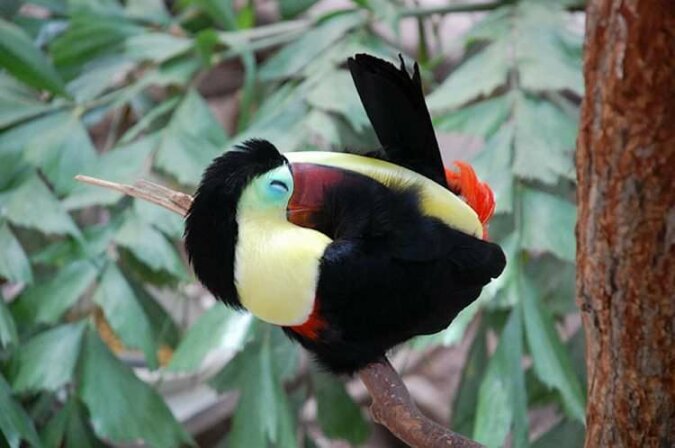 Ich ogon można unieść nad głowę, co pozwala tukanom zwinąć się w kłębek podczas snu. Wygląda całkiem uroczo.