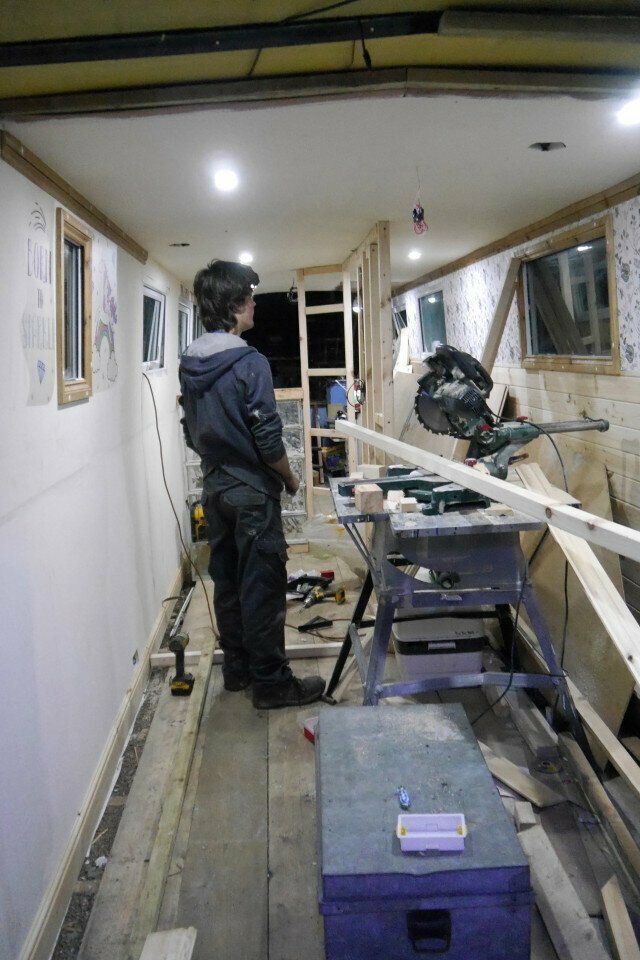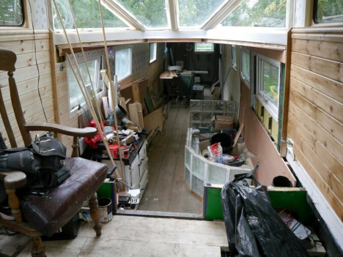 Najpierw usunięto wszystkie przegrody i uzyskano otwartą przestrzeń. W niektórych miejscach do budowy ramy użyto drewnianej belki i metalowego profilu, a następnie facet zaczął ją stopniowo wypełniać.