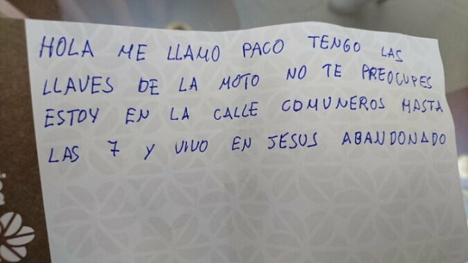 Pedro, 27-letni mieszkaniec hiszpańskiego miasta Murcia, przeszedł przez to wszystko, gdy zdał sobie sprawę, że upuścił kluczyki do motocykla na ulicy. Przeszukał całe mieszkanie, a potem, nie bardzo licząc na sukces, wrócił na parking, gdzie zostawił motocykl. Nie mógł znaleźć kluczyków, ale z ulgą przekonał się, że motocykl nadal stoi. A potem zauważyłem notatkę na przedniej szybie...