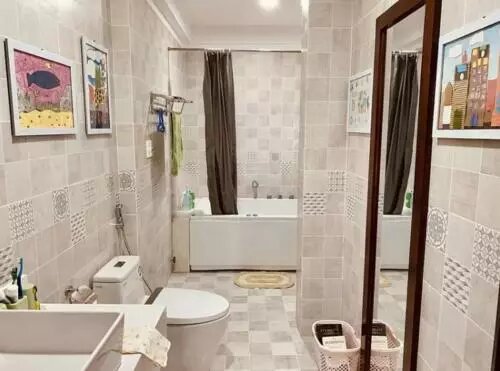 WC i łazienka są połączone. Postanowili udekorować ten pokój w delikatnych białych kolorach. Remont został przeprowadzony zgodnie z nowoczesnymi standardami. Jednak dla tak dużej rodziny połączenie toalety z łazienką może spowodować pewne niedogodności. Na przykład, gdy jeden członek rodziny bierze prysznic, inny może potrzebować skorzystać z toalety.
