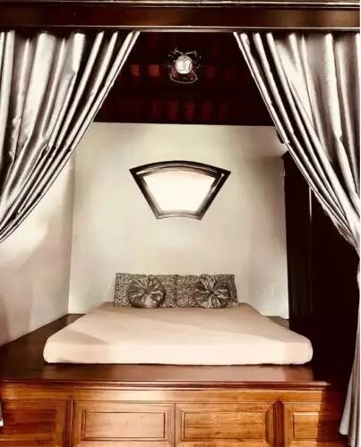 Do sypialni i salonu wybrano styl orientalny, w którym zasłony odgrywają rolę oddzielającą dwie strefy. Salon pełni również funkcję jadalni podczas obiadu czy kolacji.