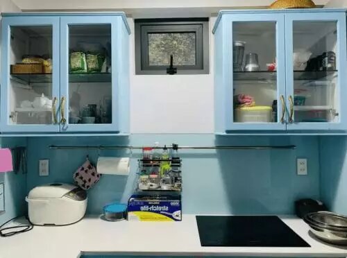 Dalej widzimy kuchnię, która ma wszystko, czego potrzebujesz do pracy. Szafki kuchenne są pomalowane na niebiesko, a drzwiczki są ze szkła. Wszystko wygląda bardzo harmonijnie.