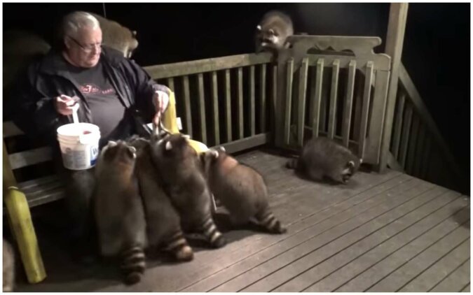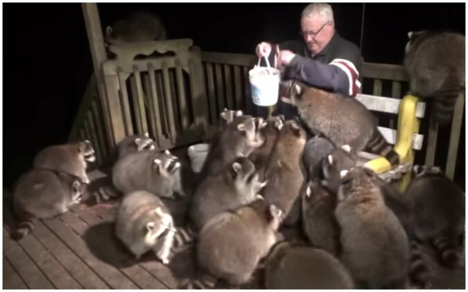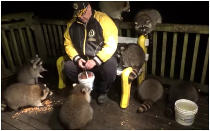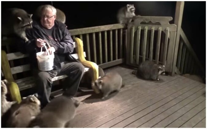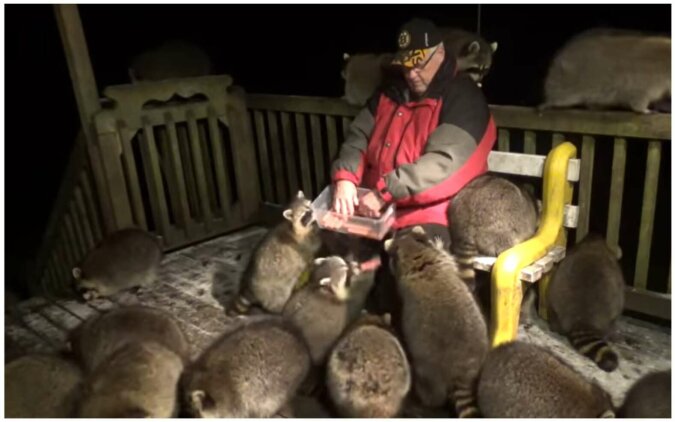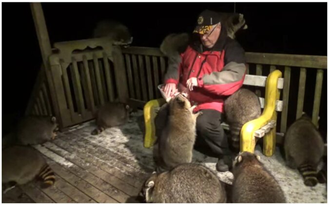 Mieszkaniec Kanady, James Blackwood, od prawie 25 lat karmi dzikie szopy, które żyją w lesie w pobliżu jego domu.