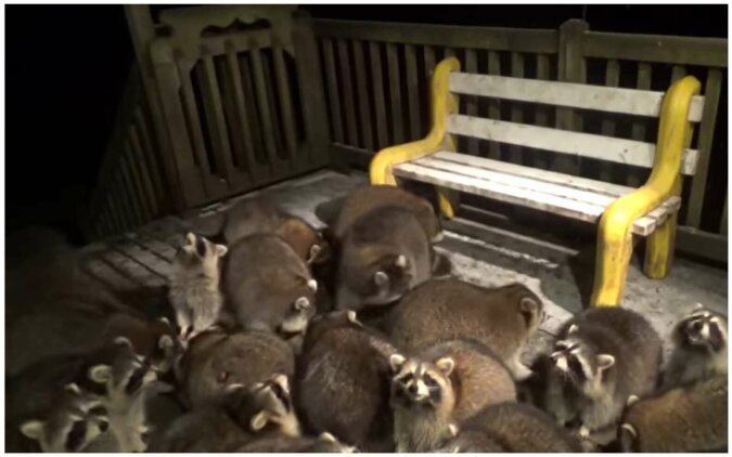 Mężczyzna niesie ze sobą wiadro parówek, kiełbasek lub karmy dla psów. Czasami (jeśli szopów jest dużo i są bardzo głodne) James musi wracać do domu po drugie lub nawet trzecie wiadro jedzenia. Należy zauważyć, że szopy są bardzo przywiązane do Jamesa i zachowują się z nim całkowicie spokojnie i przyjaźnie. Bliżej zimy apetyt szopów rośnie, więc nocne kolacje dłużej, a jedno wiadro to zdecydowanie za mało.