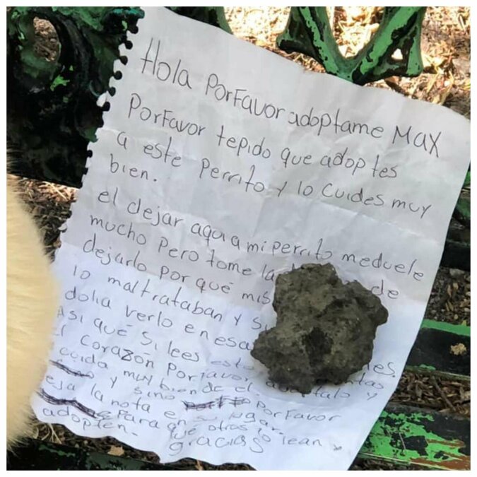"Cześć. Proszę, zaadoptuj tego psa (ma na imię Max) i zaopiekuj się nim. Zostawienie tu psa jest dla mnie bardzo bolesne, ale podjąłem tę decyzję, ponieważ moja rodzina zawsze go źle traktowała, obrażała i było mi tak smutno, że cierpiał w tych złych warunkach. Jeśli to czytasz i martwisz się z całego serca, zabierz go i się nim zaopiekuj. Jeśli nie, zostaw kartkę tam gdzie była, aby inni mogli ją przeczytać i zabrać Maxa. Dziękuję."