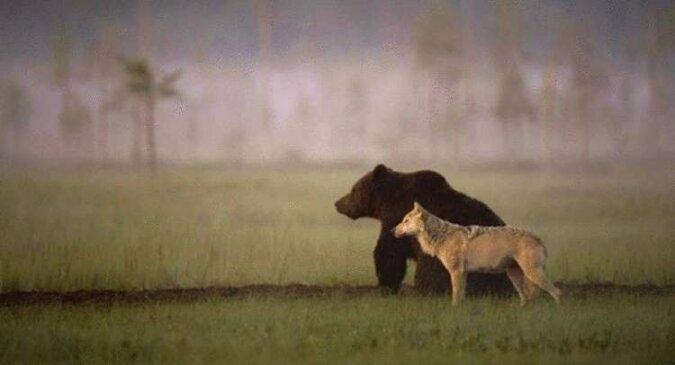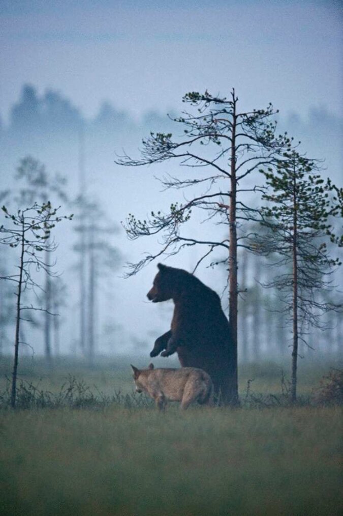 Fiński fotograf Lassi Rautjanen był świadkiem tak niezwykłej przyjaźni między wilczycą a niedźwiedziem! Przez 10 dni 56-letni mężczyzna obserwował, jak sobie radzą te dwa drapieżniki.