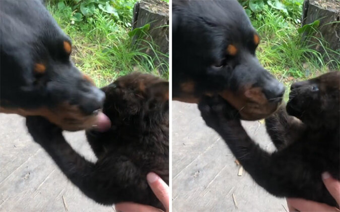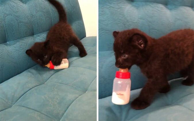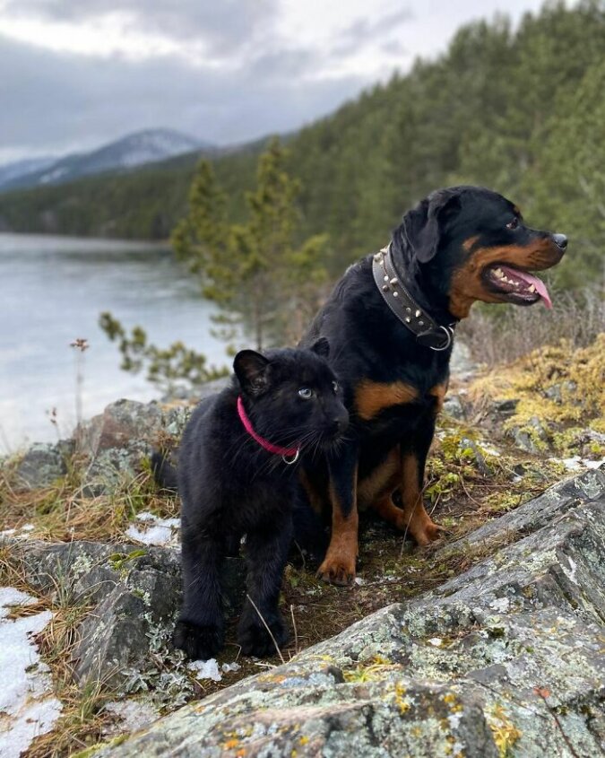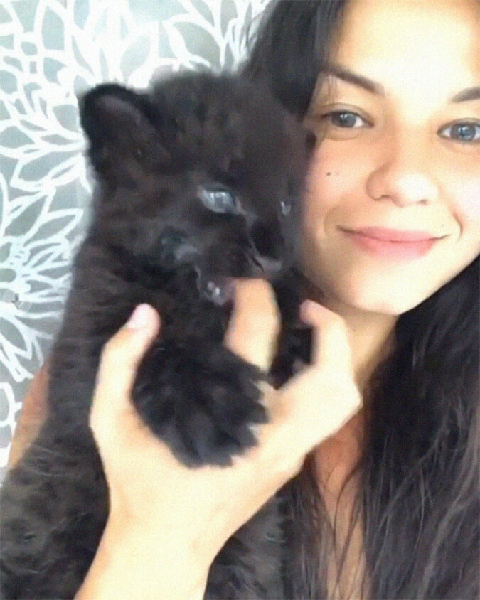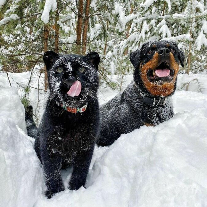 Chodzi o to, że nie najlepsze warunki pierwszych dni wpłynęły na zdrowie Luny, była ona leczona przez długi czas, ale nadal pozostaje w tyle w rozwoju w porównaniu ze swoimi dzikimi krewnymi. Ale to na lepsze, mniej agresji i więcej towarzyskości. Aby pokazać małej panterze właściwy przykład, została przekazana pod opiekę dorosłego i poważnego psa Venzę. I zadziałało!