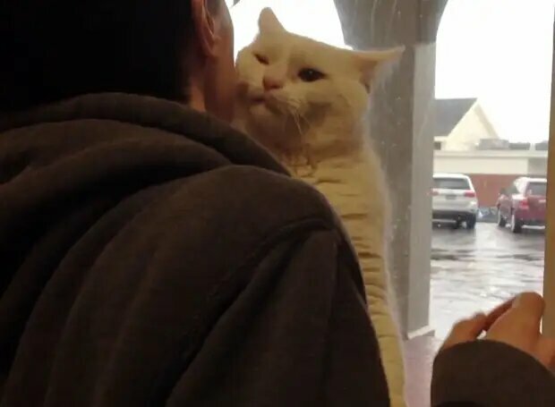 Gdy tylko para weszła do schroniska i zaczęła chodzić dookoła, patrząc na zwierzęta, dość duży biały kot skoczył na chłopaka Stephanie. Bardzo wygodnie na ulokował się na ramieniu lekko zdziwionego chłopaka. Kot po prostu emanował czułością.