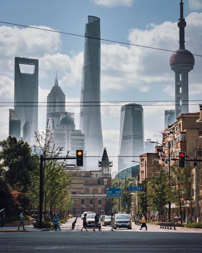 Zdjęcie 8. Wieżowce w Szanghaju. W okolicy Pudong, na tle starych, ale bardzo estetycznych budynków, znajdują się ogromne wielokondygnacyjne kompleksy biurowe.