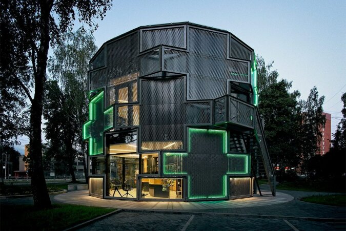 Zdjęcie 6. Budynek apteki na Łotwie. Wykonany z ciemnej metalowej siatki i podświetlany neonem, ma trzy kondygnacje z wysokimi sufitami.