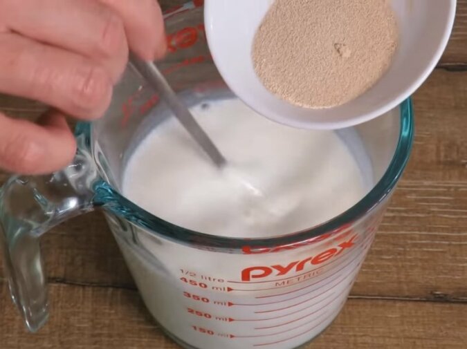 1. Na samym początku rozpuść drożdże w ciepłym mleku. Następnie dodaj 2 łyżeczki cukru, wymieszaj i odstaw na 5-7 minut.