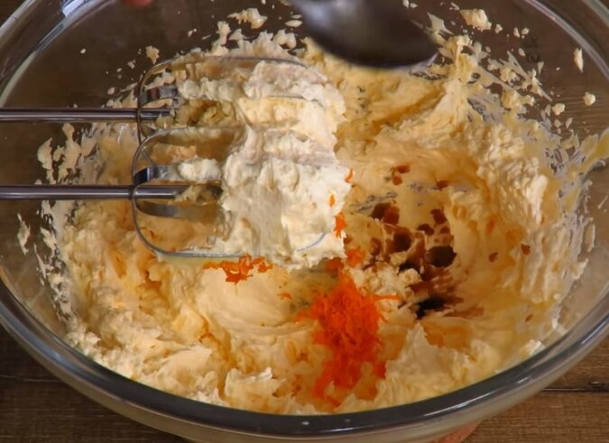 Do powstałej mieszanki dodaj skórkę pomarańczową i ekstrakt waniliowy, wszystko wymieszaj, a następnie wlej drożdże z mlekiem i ponownie wymieszaj. Na koniec stopniowo wsypuj mąkę i mieszaj składniki, aż ciasto będzie lepkie.