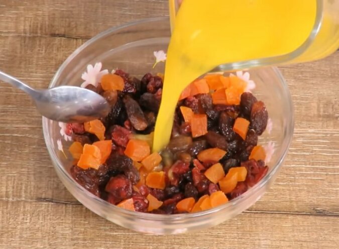 2. Teraz zalej kandyzowane owoce sokiem pomarańczowym i pozwól im spęcznieć przez 45 minut.