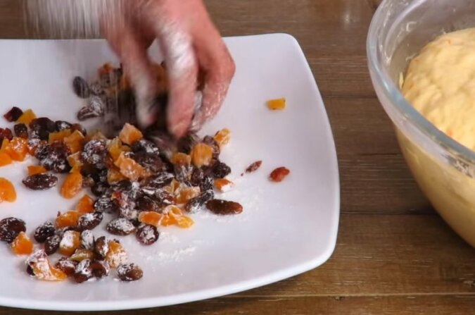 6. W czasie, gdy ciasto rośnie, można trochę odpocząć, a gdy się podniesie, wylej kandyzowane owoce na sito, dokładnie strząśnij nadmiar soku - już nie będziesz go potrzebować. Osusz kandyzowane owocy ręcznikiem papierowym i posyp mąką tak, aby były suche i dobrze wtopiły się w ciasto.