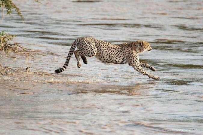 „Najpierw przywódca gepardów wskoczył do rzeki, a wkrótce za nim podążyły dwa kolejne. Dwa najmniejsze gepardy w grupie odczekały kilka sekund, zanim wskoczyły do wody”.