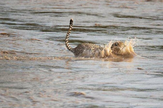 Miały tylko jeden cel – przepłynąć przez rzekę i postanowiły to osiągnąć. Do wody wskoczyły największe gepardy, a publiczność natychmiast wstrzymała oddech. Wkrótce podążyło za nimi dwóch innych. Podczas gdy wszyscy stali nieruchomo i zastanawiali się, czy drapieżniki przedostaną się na drugą stronę, fotografowie Arnfinn Johansen i Buddilini De Soisa skorzystali z okazji i wyciągnęli aparaty. Obojgu udało się doskonale uchwycić ten moment.