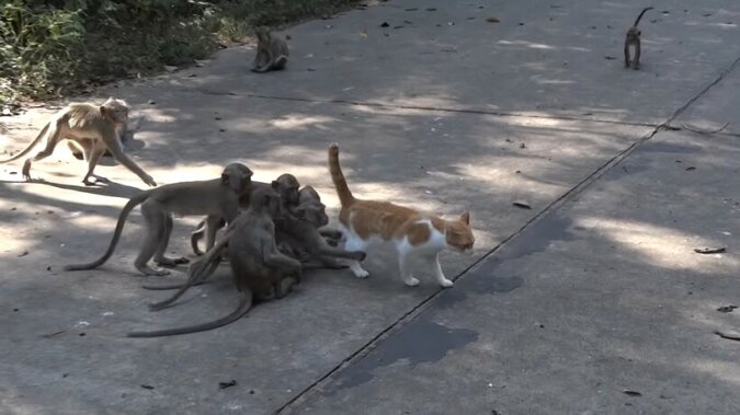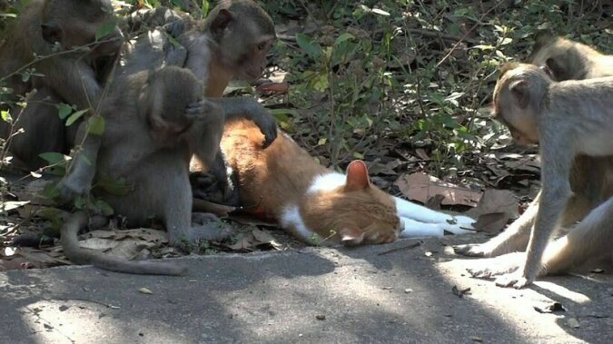Koty to dla nas pospolite zwierzęta, więc nie dziwimy się, jeśli spotkamy któregoś z nich na ulicy, czego nie można powiedzieć o małpach. Autor filmu, który możecie obejrzeć poniżej, uchwycił niezwykły obraz tego, jak małe naczelne nie mogą zrozumieć, co to za zwierzę. Podczas gdy kot grzeje się na słońcu, małpy postanowiły dokładnie zbadać go ze wszystkich stron. Niektóre z przyzwyczajenia przeglądają futro kota, próbując je wyczyścić, a potem inni podchodzą, chwytają rudowłosego stwora za łapę i próbują go gdzieś ciągnąć. Małpy chciały jak najszybciej zrozumieć, kto jest przed nimi, próbując pchać, gryźć i wąchać kota.
