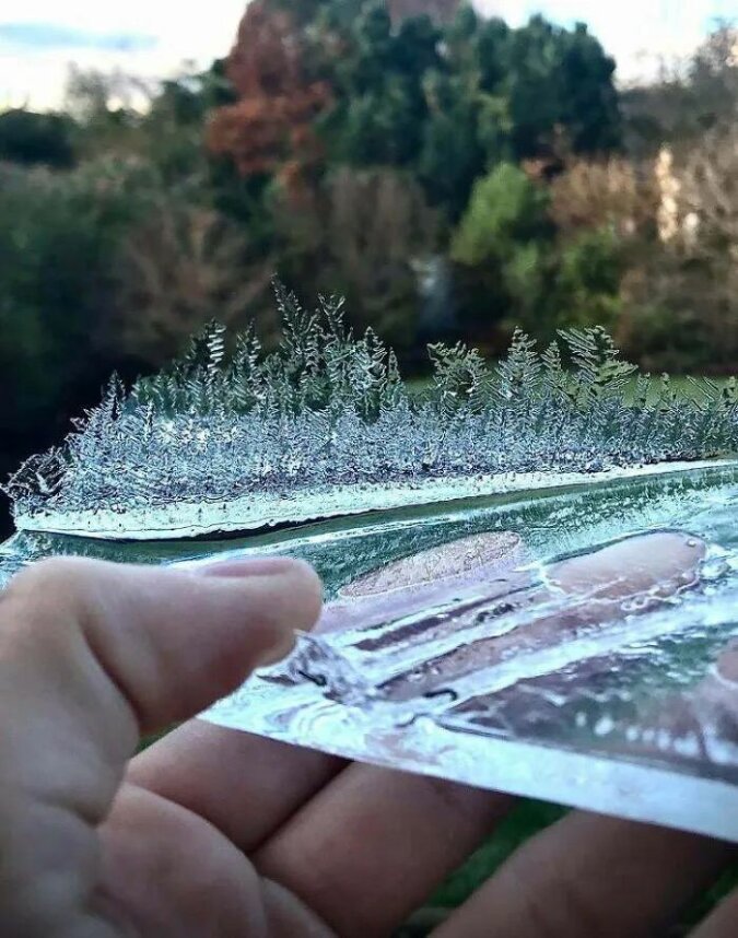 Sopel lodu, przypominający miniaturowy fantastyczny las lodowy.
