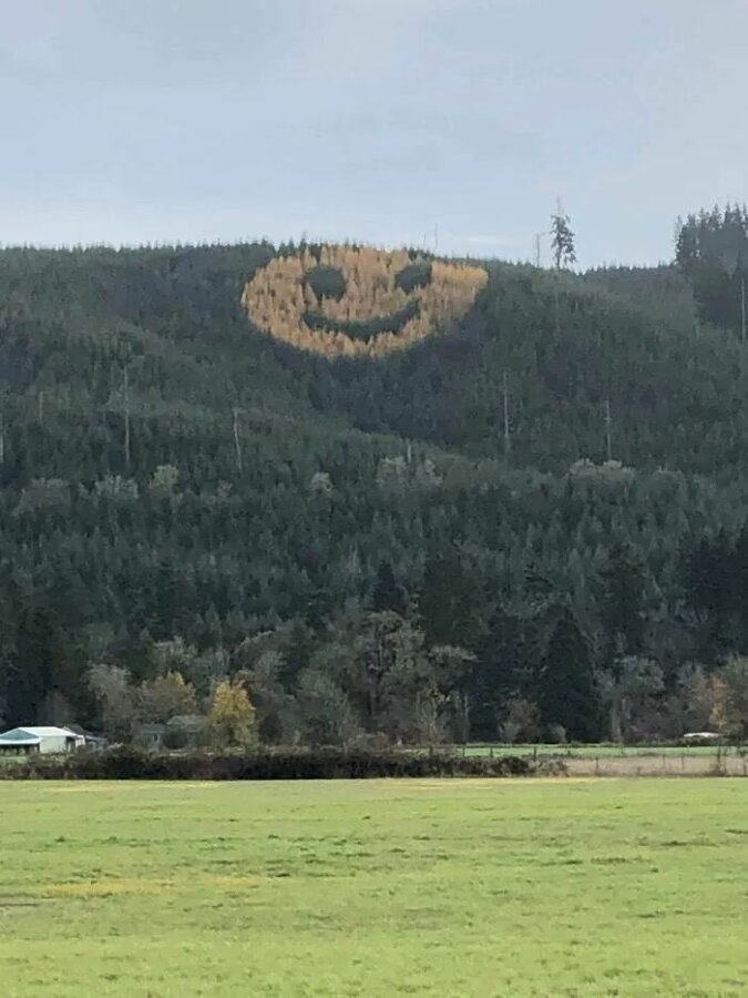 Ogrodnicy podchodzili twórczo do swojej pracy i zasadzili drzewa liściaste w lesie iglastym. Jesienią w lesie pojawia się żółty zabawny uśmiechnięty emotikon.
