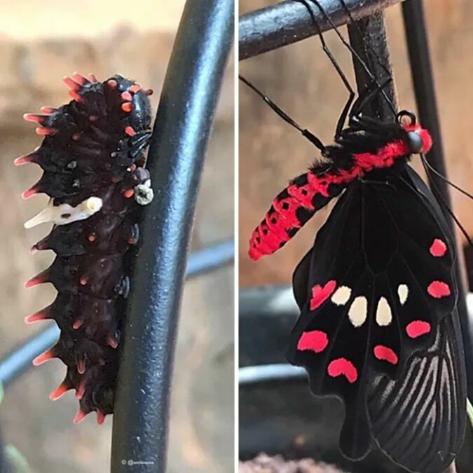 Na tym zdjęciu widać niesamowitą przemianę gąsienicy w pięknego motyla.
