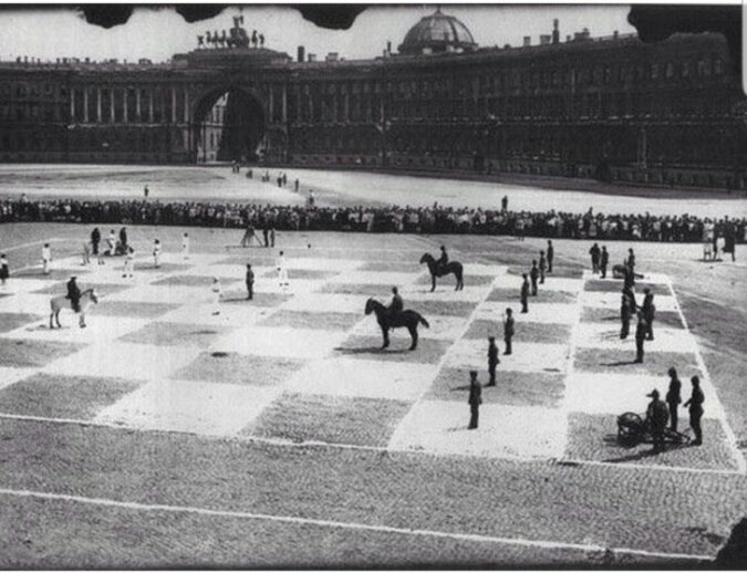Gra w szachy w carskiej Rosji, gdzie figury reprezentowali prawdziwi żołnierze