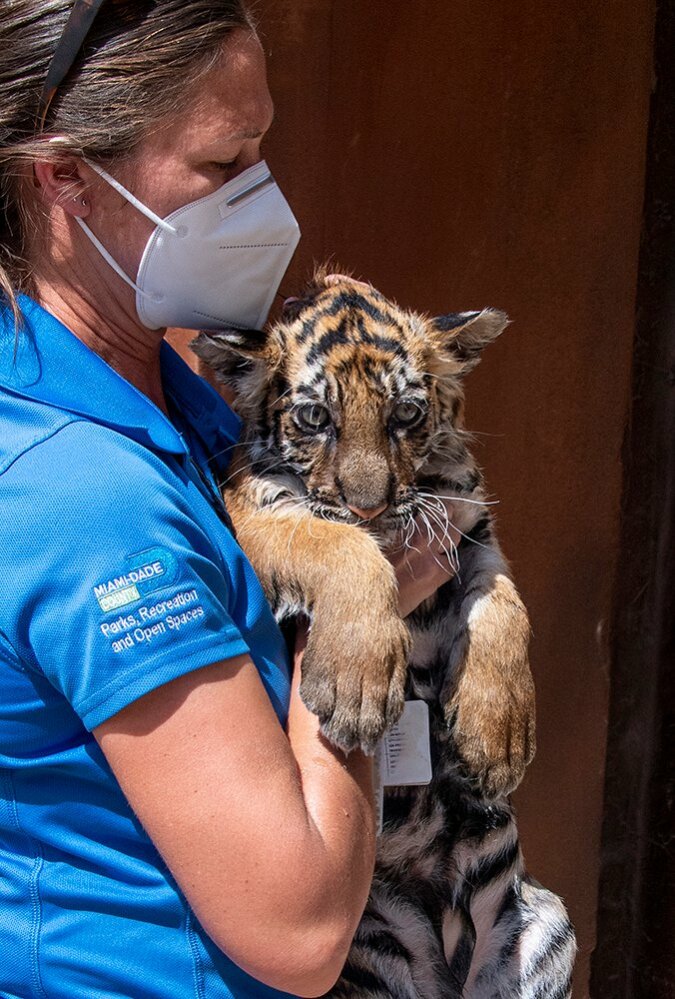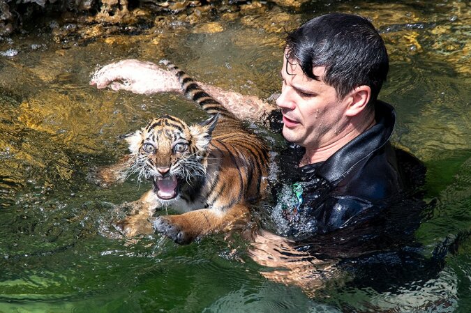 W tym miejscu należy zaznaczyć, że w wieku 3 miesięcy ta bardzo młoda tygrysica ma już charakter. Wredna i trochę histeryczna. Nie najbardziej posłuszny dzieciak w zoo, zwłaszcza gdy pracownicy przekonali się, że umiejętności pływackie tygrysicy są doskonałe i chcieli z tym skończyć, uciekła i ponownie wlazła się do stawu. Trzeba było skoczyć za nią i wyciągnąć.