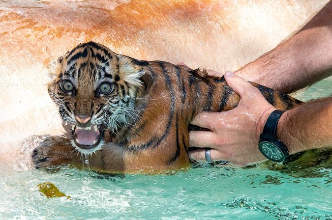 W Miami Zoo odbyła się lokalna impreza - urodzony w tym roku tygrysek po raz pierwszy przeszedł test pływania. Mówiąc najprościej, popływał w basenie, co bardzo mu się podobało. A nam się spodobało, jakie miny robił i jakie wyszły żywe ujęcia!
