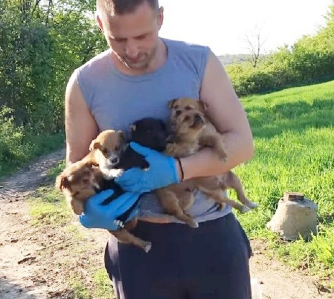 Kiedy dzieciaki zjadły i ugasiły pragnienie, wolontariusz ostrożnie wziął je w ręce i zaniósł do samochodu. Okazało się, że w sumie jest pięć szczeniąt: cztery suczki i jeden piesek. Spokojnie dali się zabrać z leśnej polany, całkowicie czując ludzką dobroć.