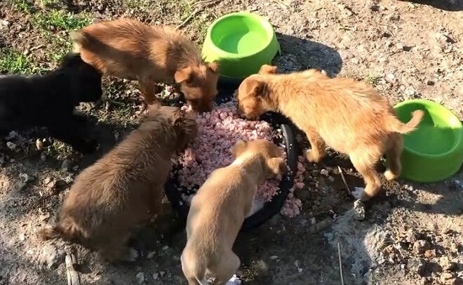 Oczywiście wszystkie maluchy były głodne, więc ludzie, zdając sobie z tego sprawę, nie przyszli z pustymi rękami. Nasypali jedzenie do dużej miski i patrzyli, jak szczenięta połykają kawałek po kawałku. Jakoś wystarczyło każdemu, choć wolontariusze liczyli na uratowanie tylko jednego maluszka, a nie całej czworonożnej „rodziny”!