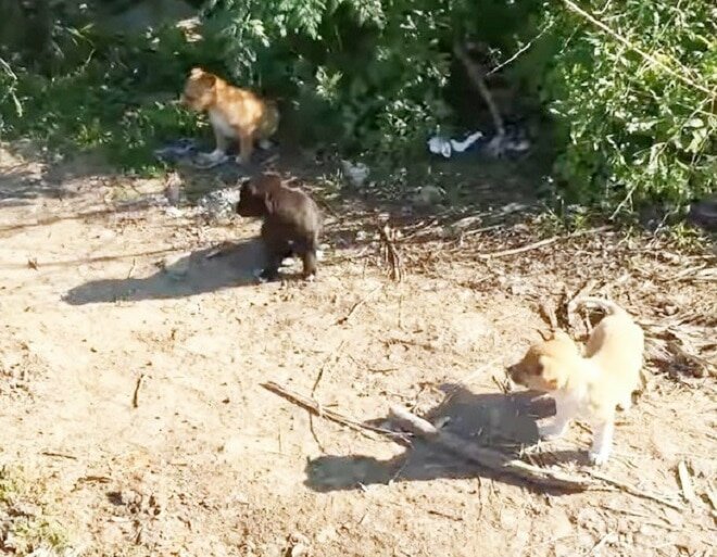Widząc ludzi, szczenię wyjrzało, a potem nagle rzuciło się na drugą stronę, do krzaków. I za chwilę wyskoczyły stamtąd inne szczenięta! Kilka malutkich stworzeń przywitało ludzi, radośnie merdając ogonami. Małe okazały się oswojone i wcale nie bały się obcych. Wydawało się, że długo czekały, aż ktoś zabierze je ze sobą tak szybko, jak to możliwe!