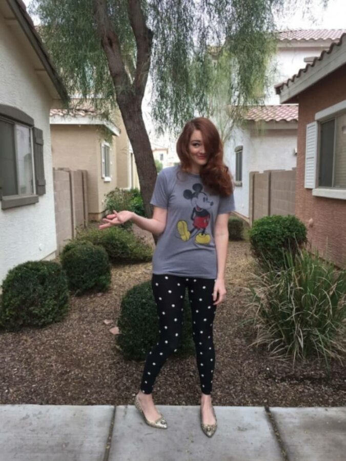 „Prawdopodobnie ten dzień jest moim ulubionym. Te legginsy w kropki dobrze komponują się z koszulką z Myszką Miki. Ale do tego stroju nie założyłabym takich butów. Może po prostu przypomniały synowi Minnie ”.