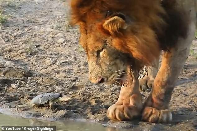 Wielki lew postanowił ugasić pragnienie po polowaniu, a tu - żółw!