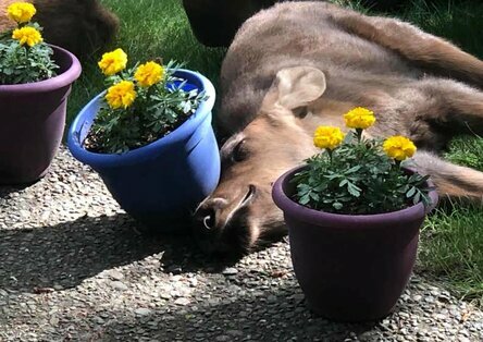W pewnym momencie jedno z cieląt łosia przewróciło nosem doniczkę z nagietkami - próbował się po nim podrapać. A kiedy doniczka spadła, na twarzy młodego zwierzęcia pojawił się uśmiech.