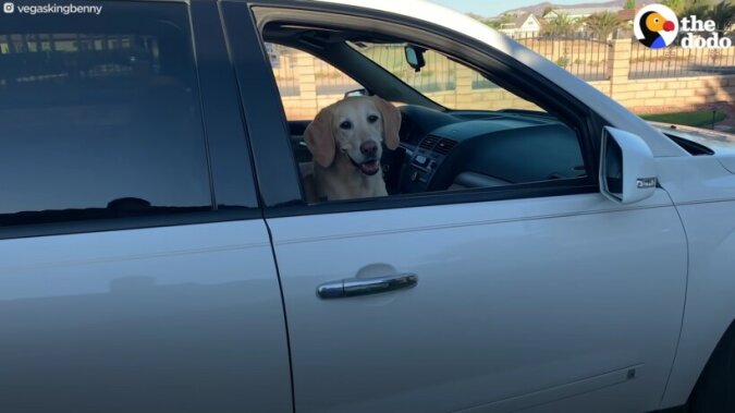 Benny wskoczył do samochodu, już wiedząc, dokąd zabierze go właścicielka. Po drodze pies niecierpliwie wyglądał przez okno, mając nadzieję, że szybko zobaczy budynek lodowiska. Dla Benny’ego zrobiono łyżwy na zamówienie. Pies wyskoczył na lód, skacząc z przyjemnością. Benny jeździ z kijem w zębach, przeskakuje przez barierki i świetnie się bawi na lodowisku.