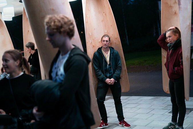 Ten przystanek jest całkowicie otwarty i nie ma ławek. Ale do dachu przymocowane są drewniane, obrotowe konstrukcje. Mogą też się kołysać. Każda oczekująca osoba może oprzeć się o te konstrukcje, schować się przed wiatrem i po prostu odizolować się.