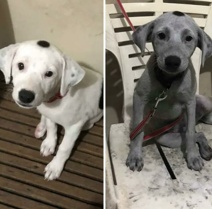 Biały szczeniak został sam w domu. W tym czasie albo został wymieniony, albo został posmarowany okruchami węgla.