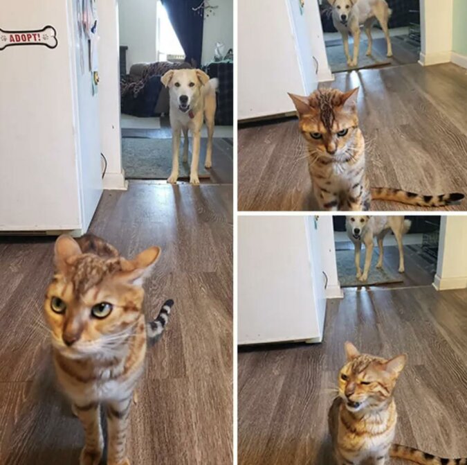 Pies ukradł jedzenie z kociej miski, a teraz kotka narzeka będąc w kuchni.