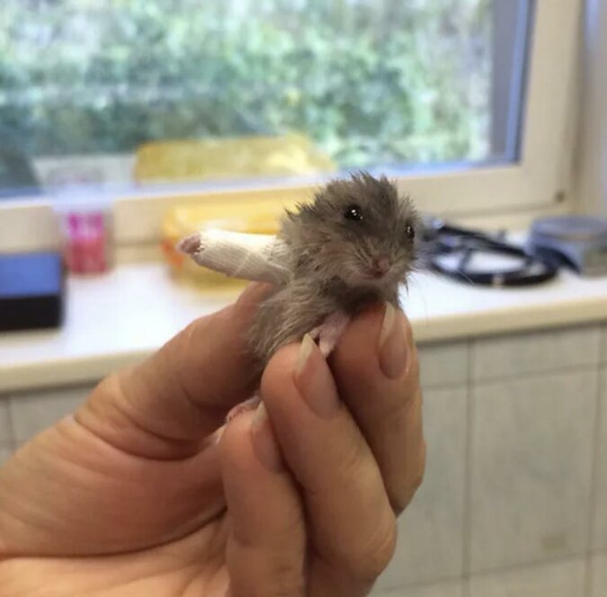 Ten nieszczęsny mały chomik złamał łapkę, ale weterynarze wymyślili w jaki sposób można mu pomóc.