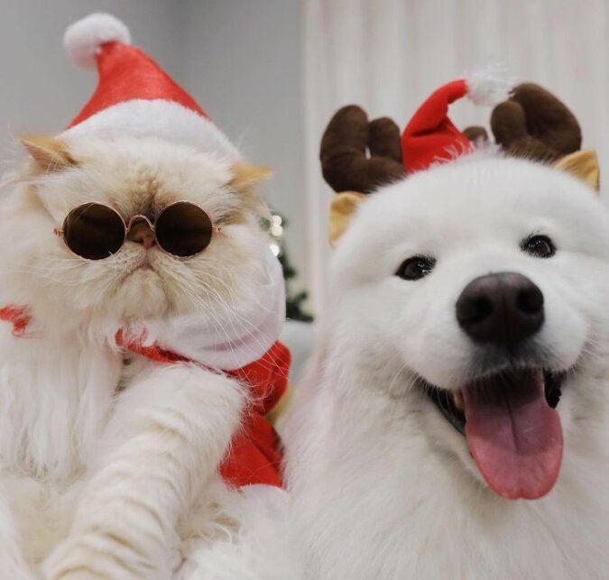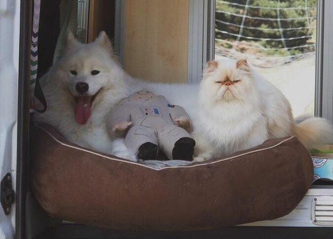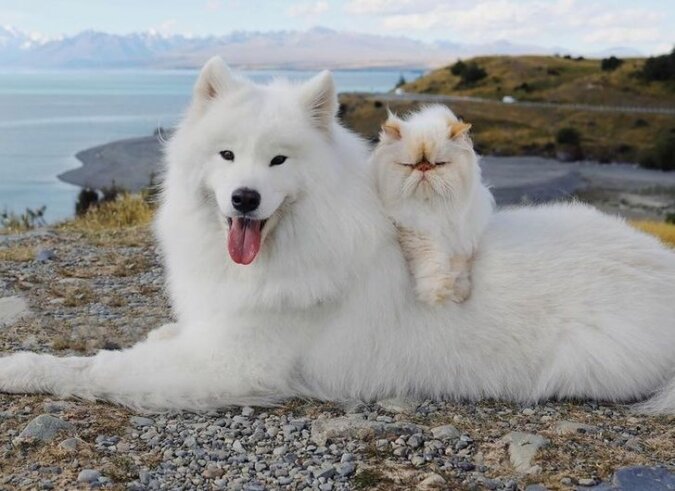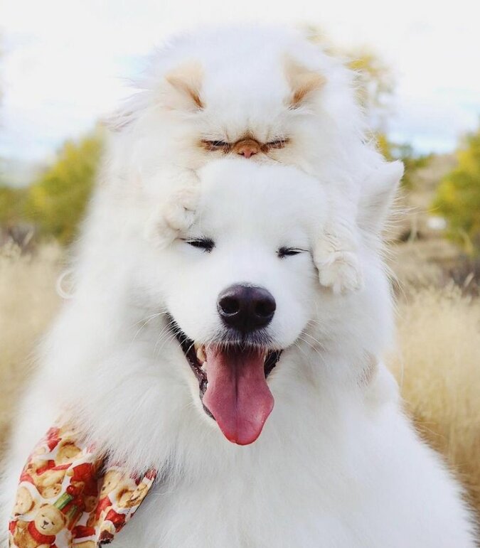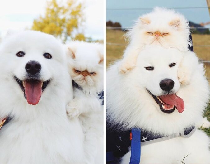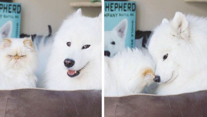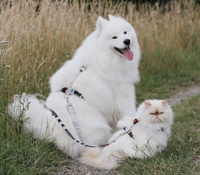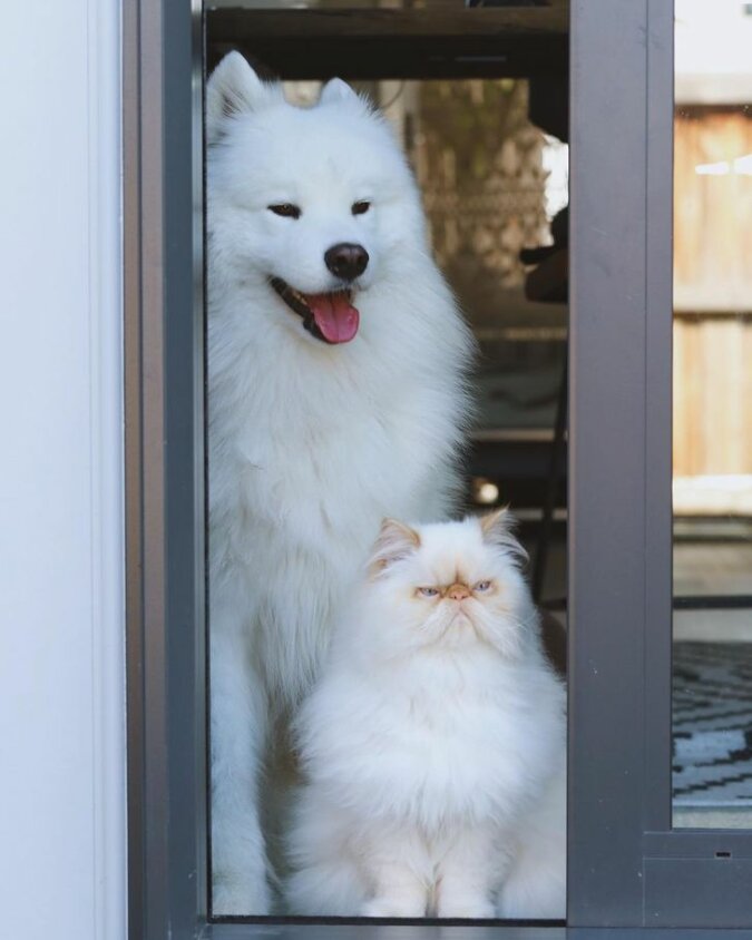 Ta dwójka jest bielsza od pierwszego śniegu, są puszyste aż do niewiarygodności, a jednocześnie – mają zupełnie inny charakter. Samoyed Kasper jest wesołym zwierzakiem i źródłem pozytywnych emocji, podczas gdy kot Romeo w zasadzie nie umie się uśmiechać. A jednak ta dwójka się przyjaźni jak nikt inny!