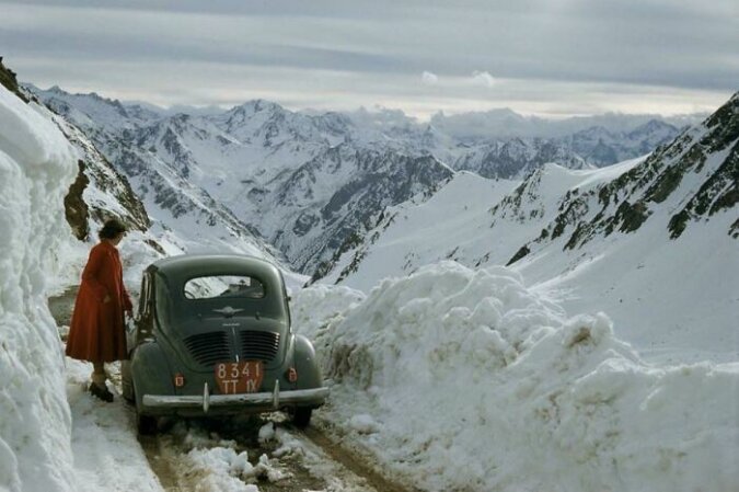 Kobieta za kierownicą utknęła na śnieżnej przełęczy w Pirenejach, 1956 rok