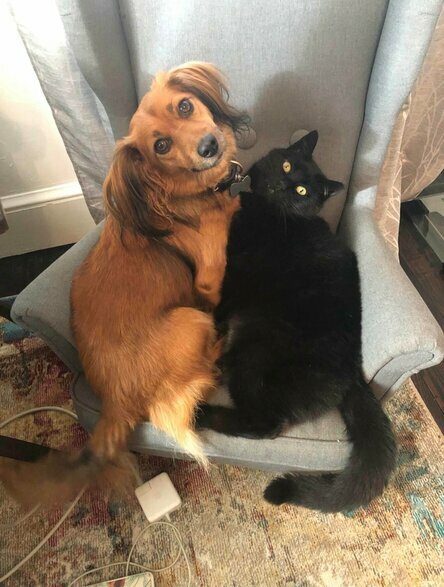 Kiedy Lindsay przyniosła krzesło do domu, położyła na siedzeniu ulubioną zabawkę jamnika – on od razu zrosumiał, co to znaczy. Wystarczy spojrzeć na wyraz jego twarzy – to bezcenny moment. Prawda, Franklin nie był jedynym, który zakochał się w tym krześle: Bagir też za nim szaleje i za każdym razem próbuje popchać swojego przyjaciela. Jednak jamnik nie ma nic przeciwko: mieszczą się oboje.