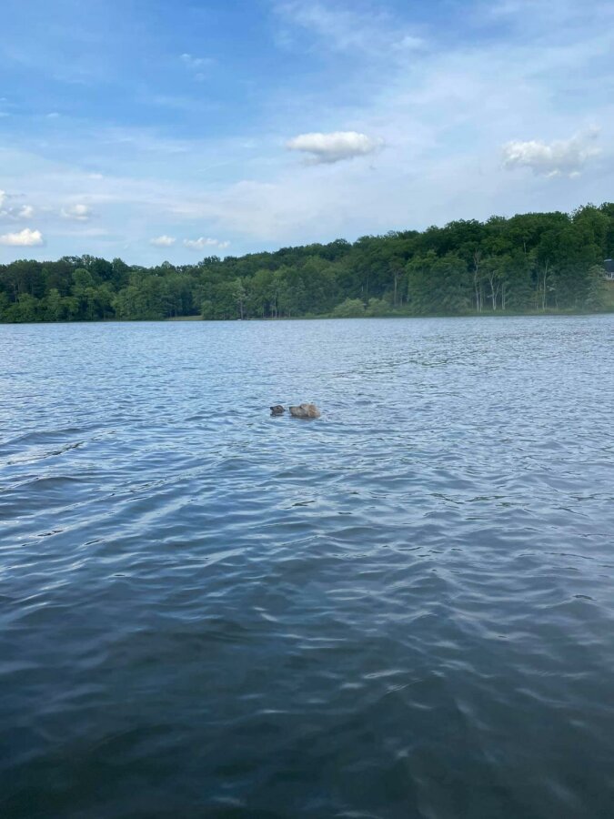 Harley płynął w kierunku brzegu, popychając coś małego. Okazało się, że to maleńki jeleń!
