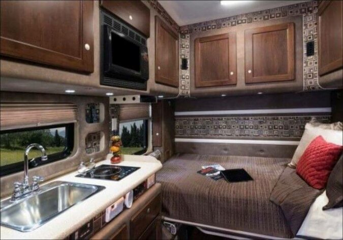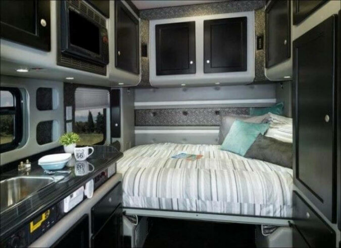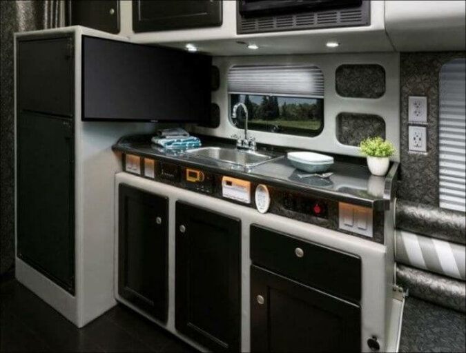 Tutaj naprawdę jest wszystko, czego potrzebujesz do komfortowego pobytu. Wygodne miejsce do „cywilizowanego” snu, składany stół, znakomita kuchnia ze zlewem i kuchenką, kuchenka mikrofalowa, liczne schowki na bagaż. Oczywiście jest kabina prysznicowa i prawie domowa toaleta. To wszystko wygląda naprawdę niesamowicie!