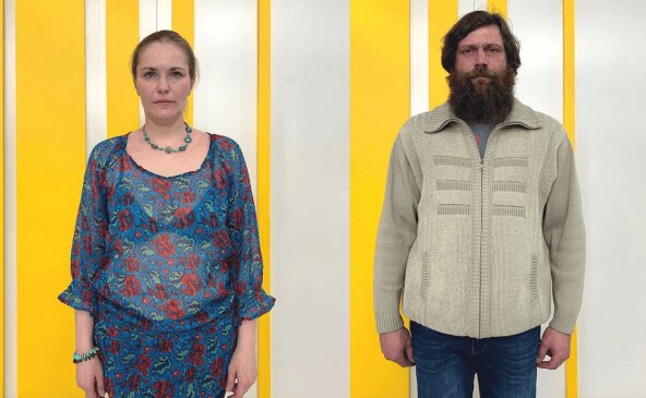 Pomimo tego, że małżonkowie mieszkają w Petersburgu, wydaje się, że mieszkają w jakimś odległym miejscu. Eugeniusz ma kudłatą brodę i długawe włosy, a Helena ubiera się niemodnie.
