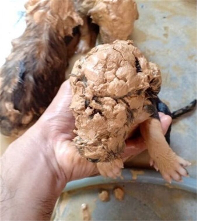 Przede wszystkim dziwne małe stworzenia przypominały szczury. Albo małe mangusty. Pod błotem nie było widać, więc Shurachet wspiął się do studni i wyciągnął całą piątkę na światło. Wtedy stało się jasne, że to zwykłe szczenięta, ale tak pokryte błotem, że zamieniły się już w żywe posągi i ledwo mogły się ruszać.