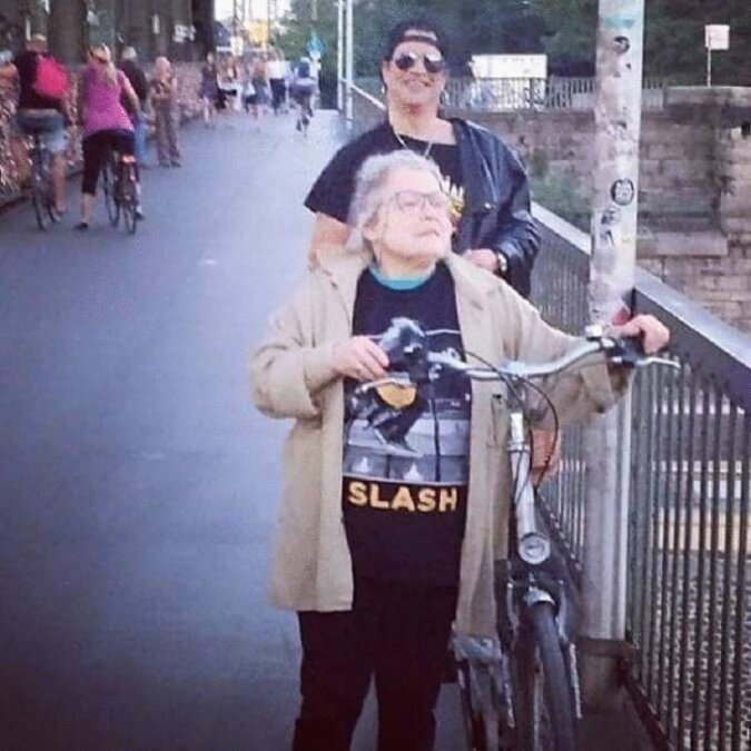 Ta starsza kobieta jest fanką muzyka Slasha, ale nie wie, że on znajduje się za nią.