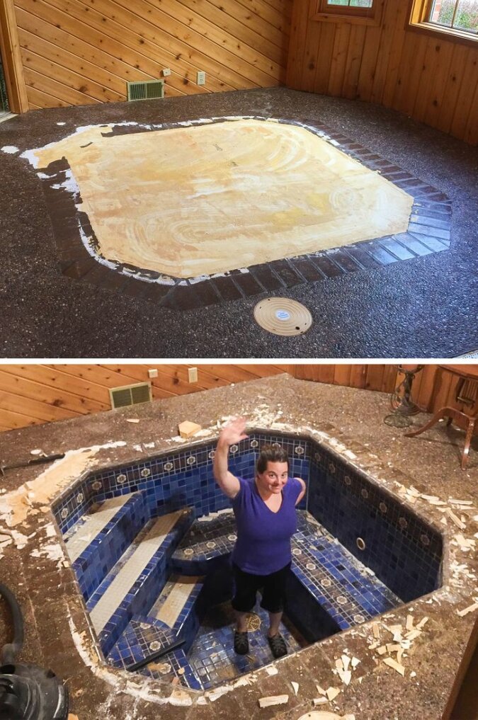 W salonie pod podłogą podniesioną znajdowała się niesamowita wanna lub mini basen - spróbuj zrozumieć teraz co to.