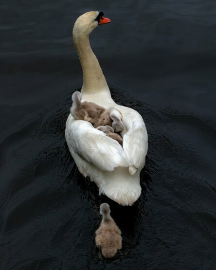 Ojciec zachowuje się bardzo cierpliwie, płynie powoli w tym samym tempie co pisklęta i uważnie czuwa nad ich bezpieczeństwem. Dzięki jego wysiłkom siedem łabędzi ma duże szanse urosnąć i wrócić do rzeki Charles ze swoimi parami w celu zwiększenia populacji tych pięknych ptaków.